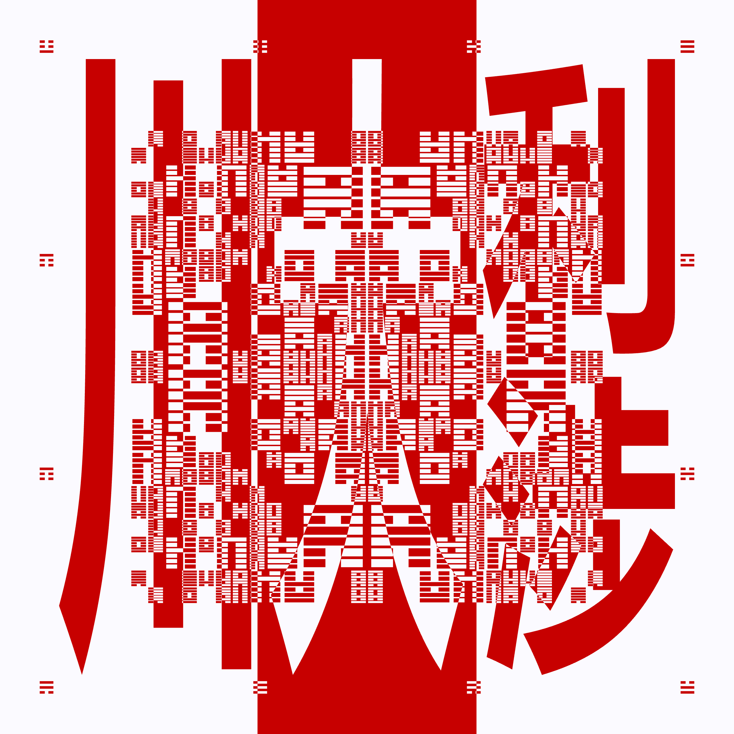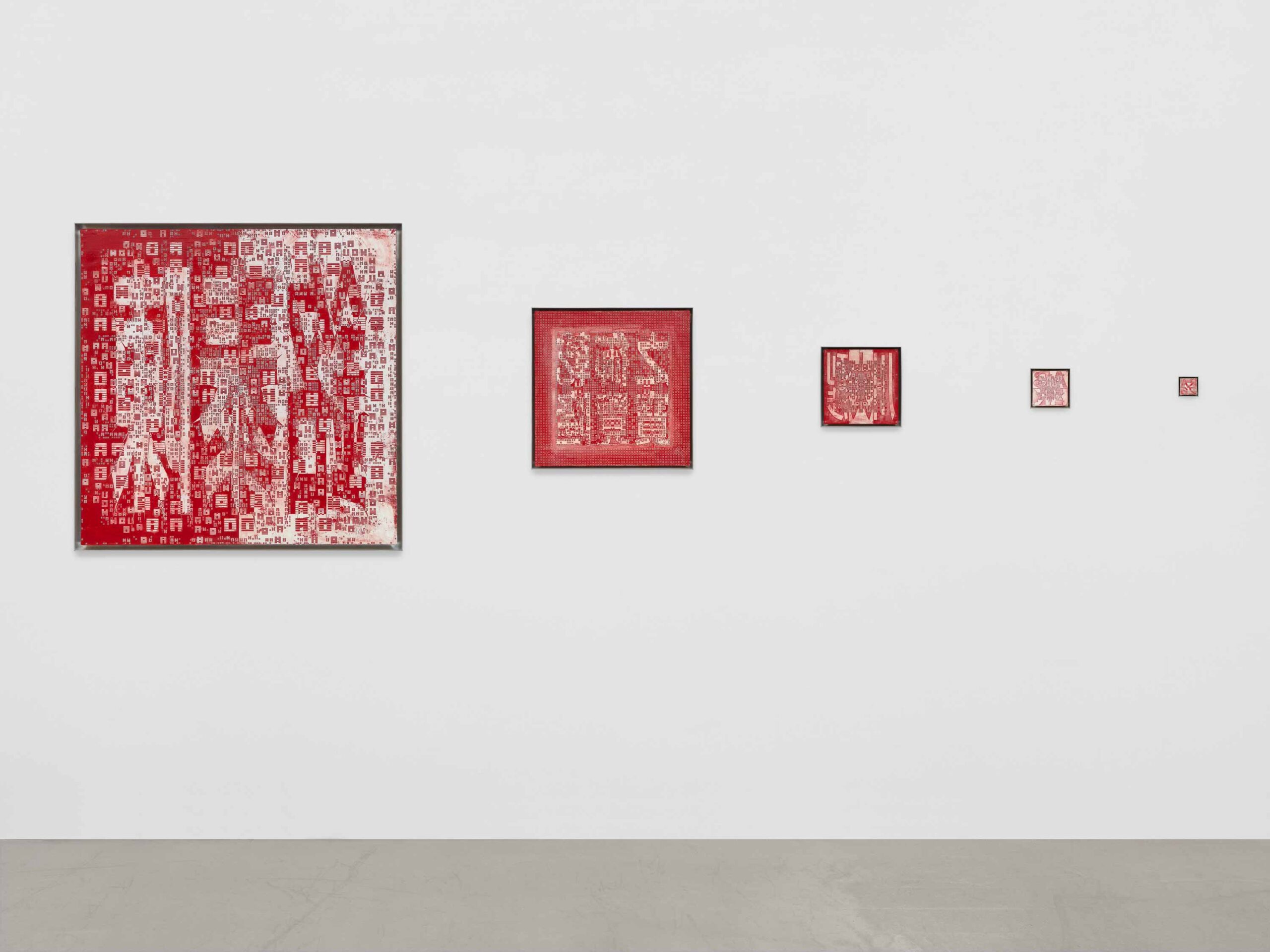 Alongside the digital work, SEAL includes a series of commissioned, customizable paintings that treat the algorithmic seal simultaneously as a technology and as an art object in itself. Building on the engraving techniques developed in Portraits of a Mind (2019– ), each painting is engraved with the collector’s own cryptographic seal, composed of characters derived from the I Ching. The seal becomes the painting, and the painting becomes the seal. Inscribed directly into the painted surface, the paintings become working seals, scaled up to take full territorial control of the art object. From 6.25cm to 2m square, the paintings correspond to different rarities of seals and mix Western and Eastern philosophies of scale, provenance and the sovereignty of the artist.